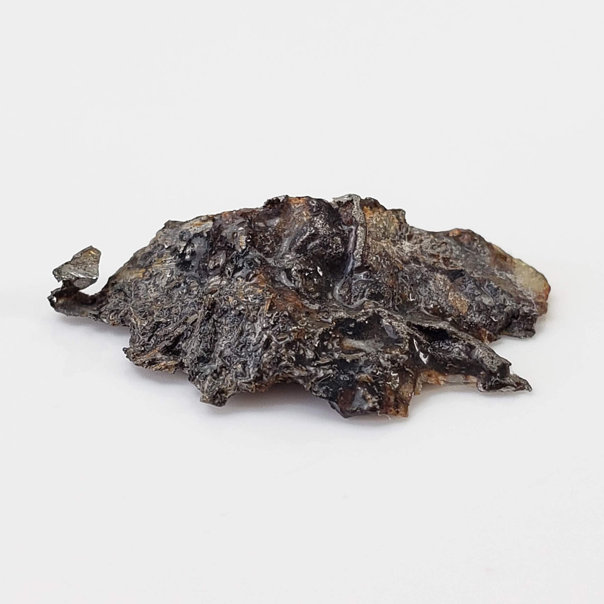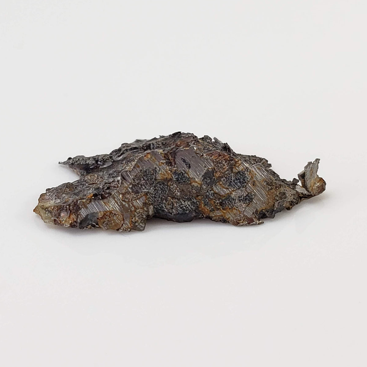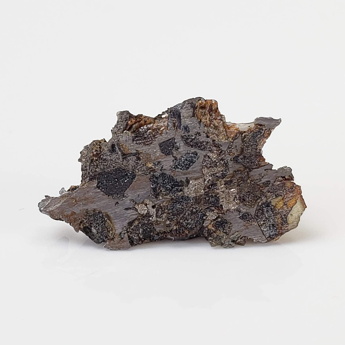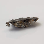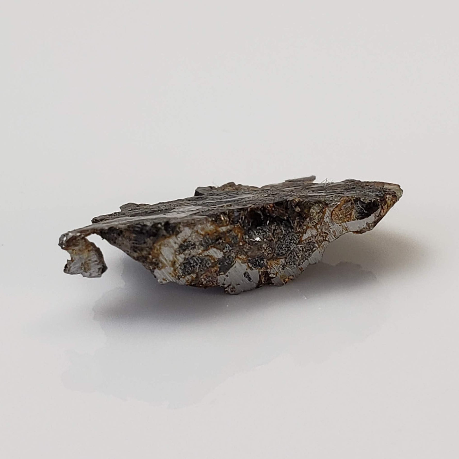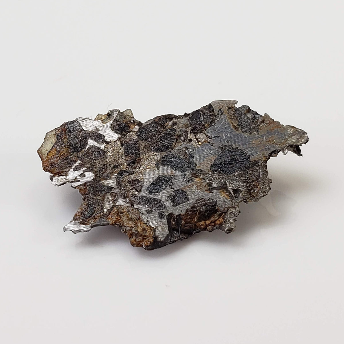 This is a nice 1.75 gram Seymchan Iron meteorite part slice measuring 21x11x5 mm. The meteorite was found in 1967 in a brook-bed flowing into the river of Hekandue, a left tributary of the river of Jasachnaja of the Magadan district, USSR. It is classified as an Iron Pallasite main group and is 1 of only 48 approved meteorites classified as such, with a recovered weight of about 323 Kg.