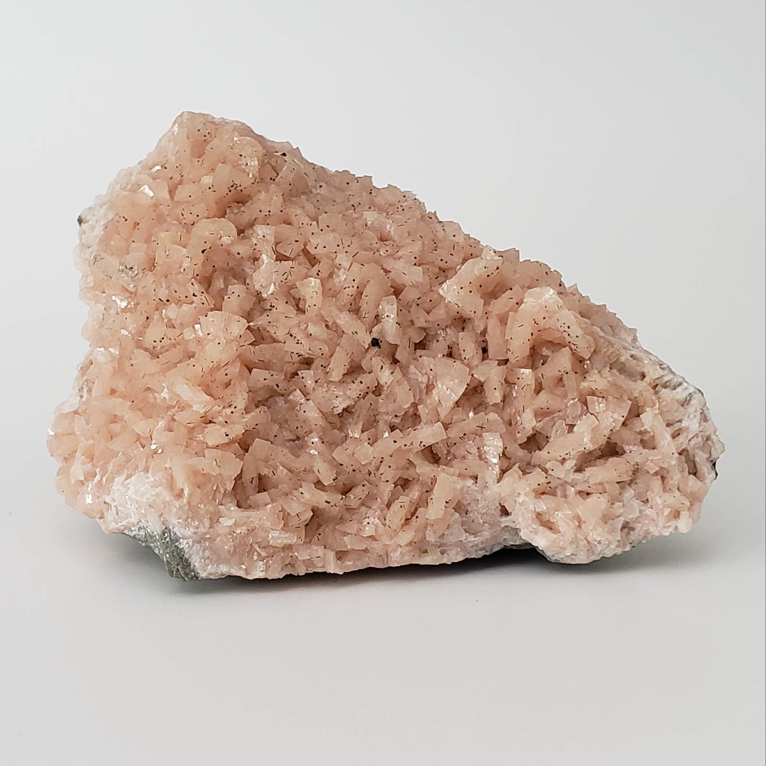 Unit price perThis is a crystal combining Dolomite and Chalcopyrite. The lovely, light pink blades of dolomite are will defined on this specimen and are covered in tiny chalcopyrite crystals.