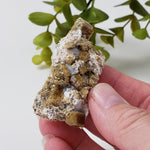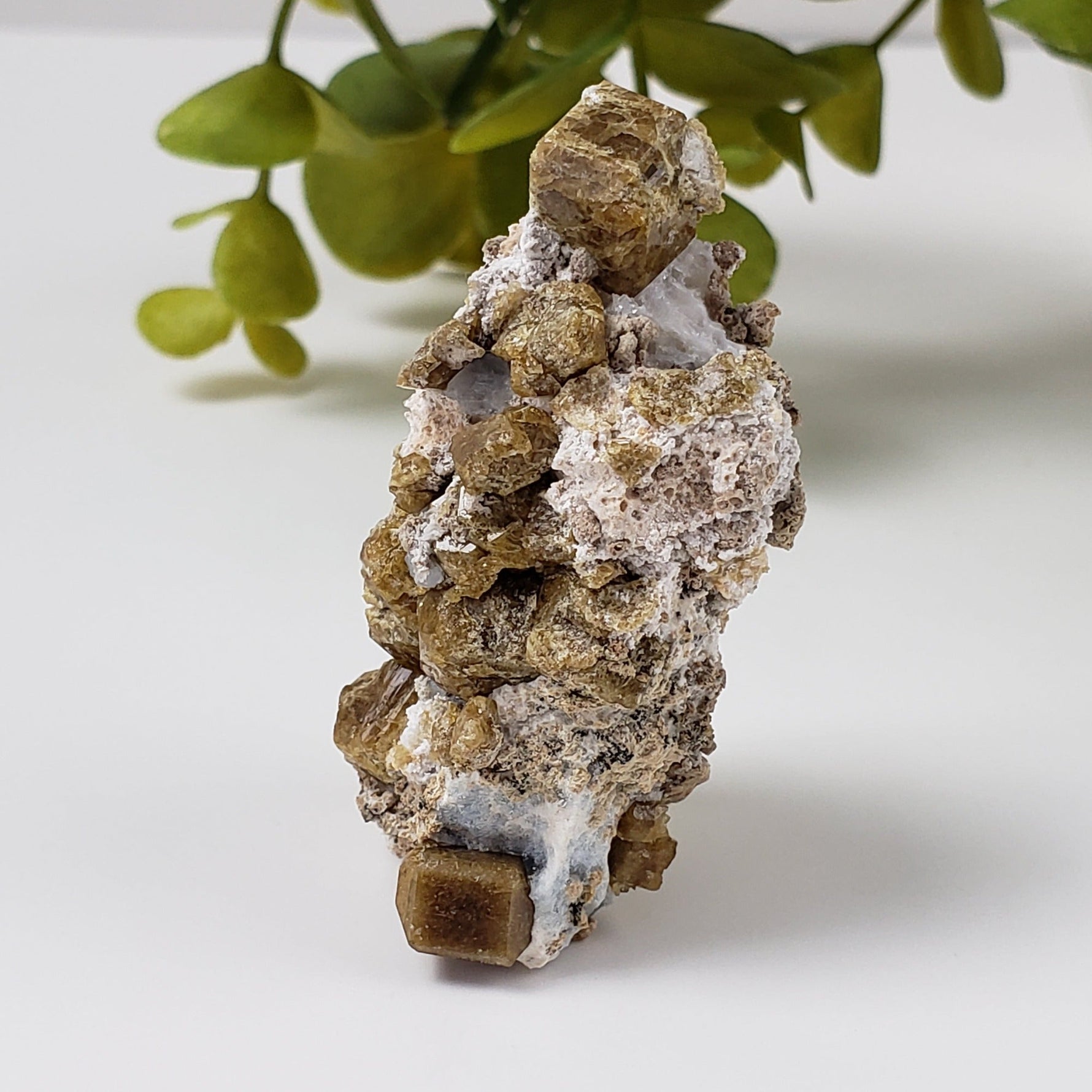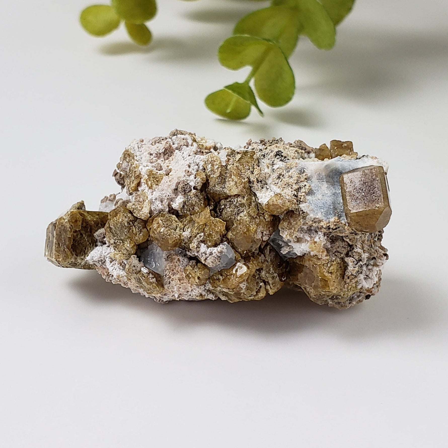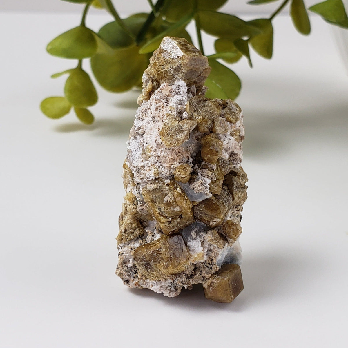 Ceci est un beau spécimen de cristaux de vésuvianite brun doré sur une matrice de carbonate blanc du Mexique. Un excellent ajout à toute collection ! Il a été découvert pour la première fois sur le mont Vésuve en Italie au XVIIIe siècle, d'où son nom.