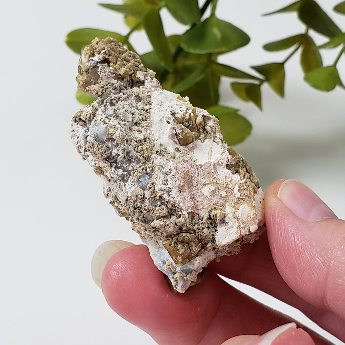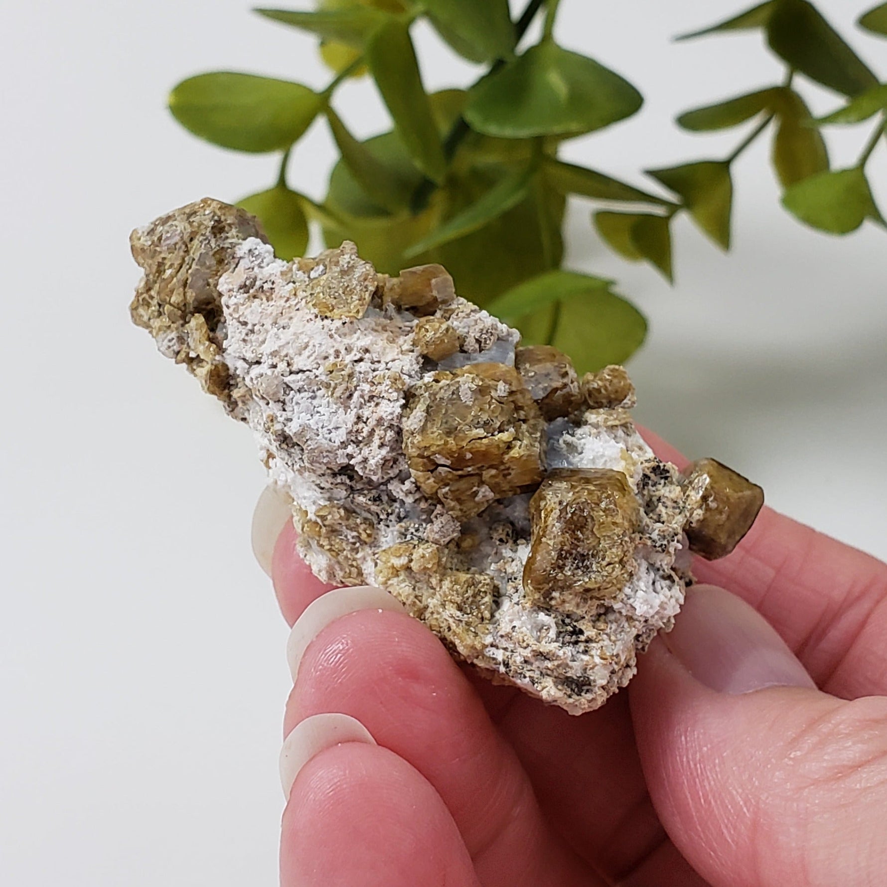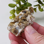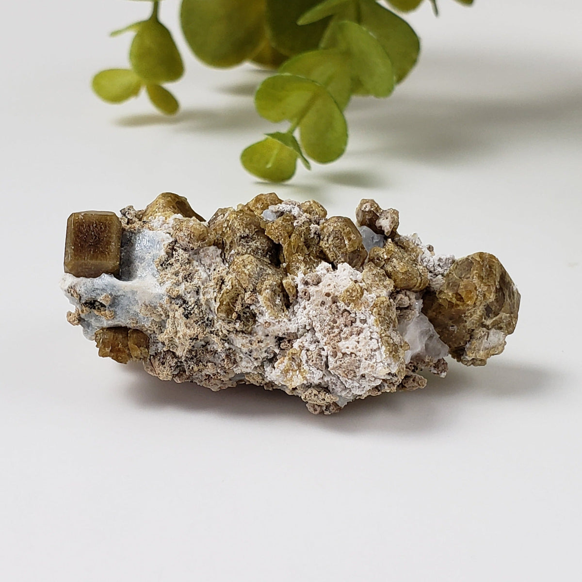Ceci est un beau spécimen de cristaux de vésuvianite brun doré sur une matrice de carbonate blanc du Mexique. Un excellent ajout à toute collection ! Il a été découvert pour la première fois sur le mont Vésuve en Italie au XVIIIe siècle, d'où son nom.