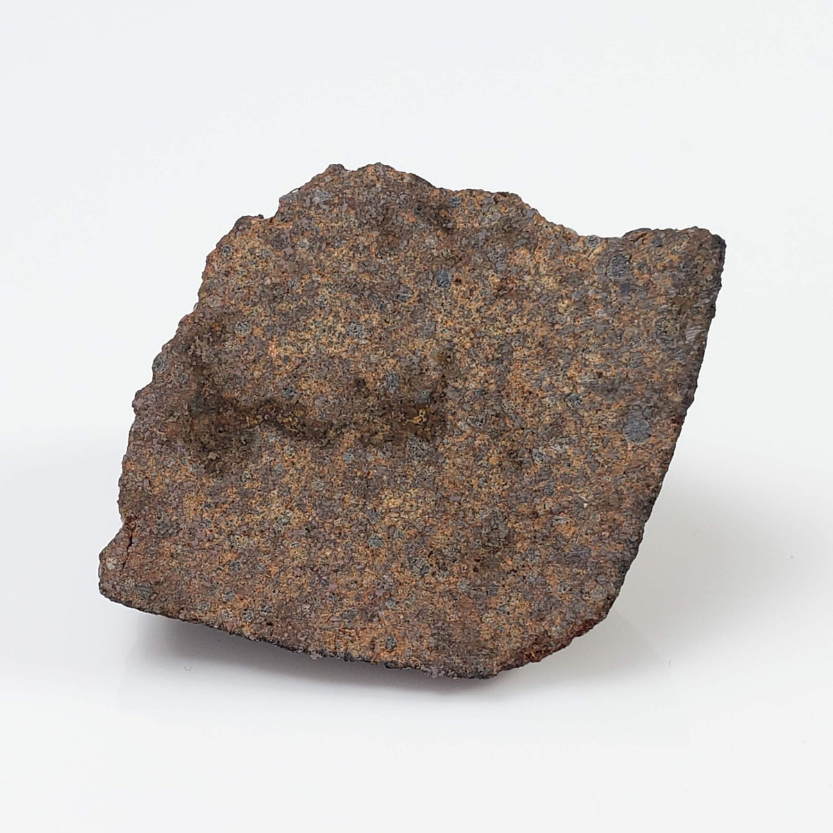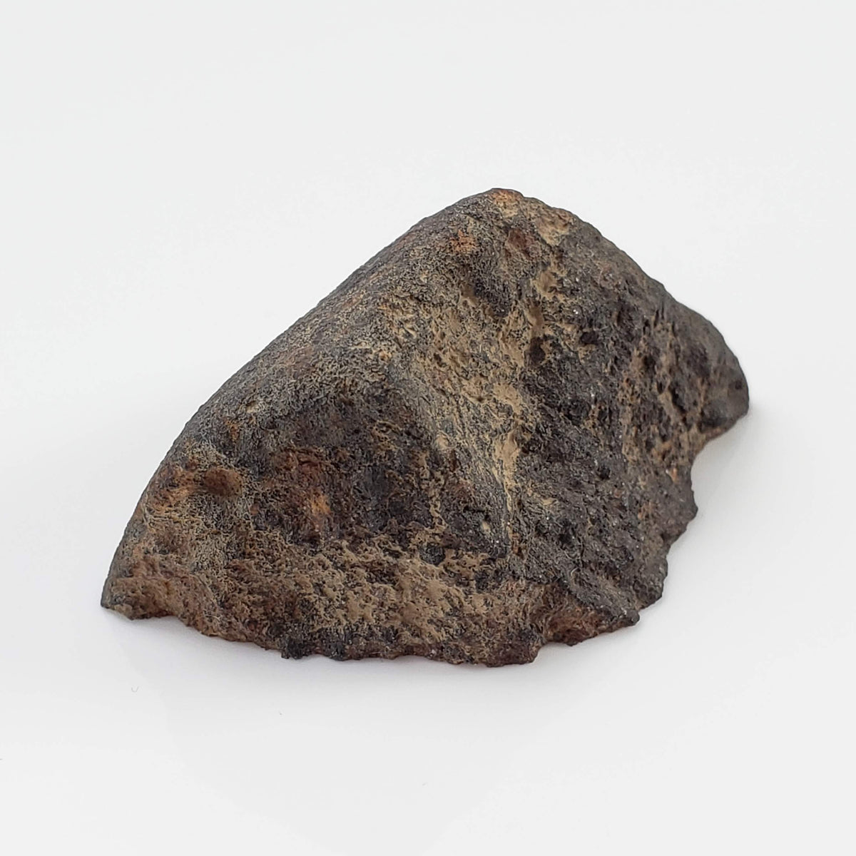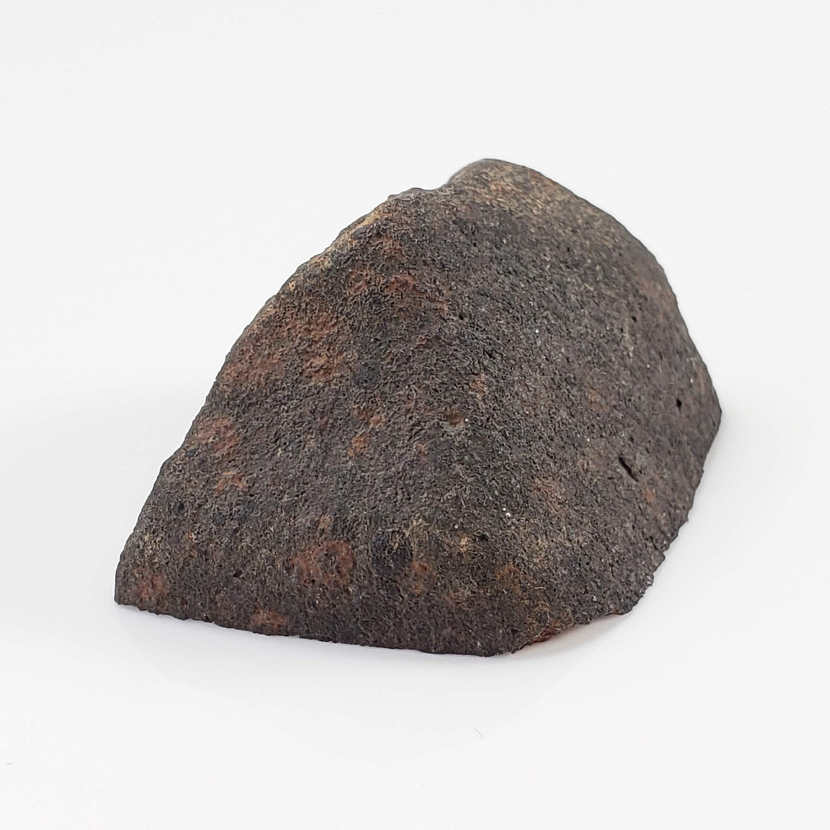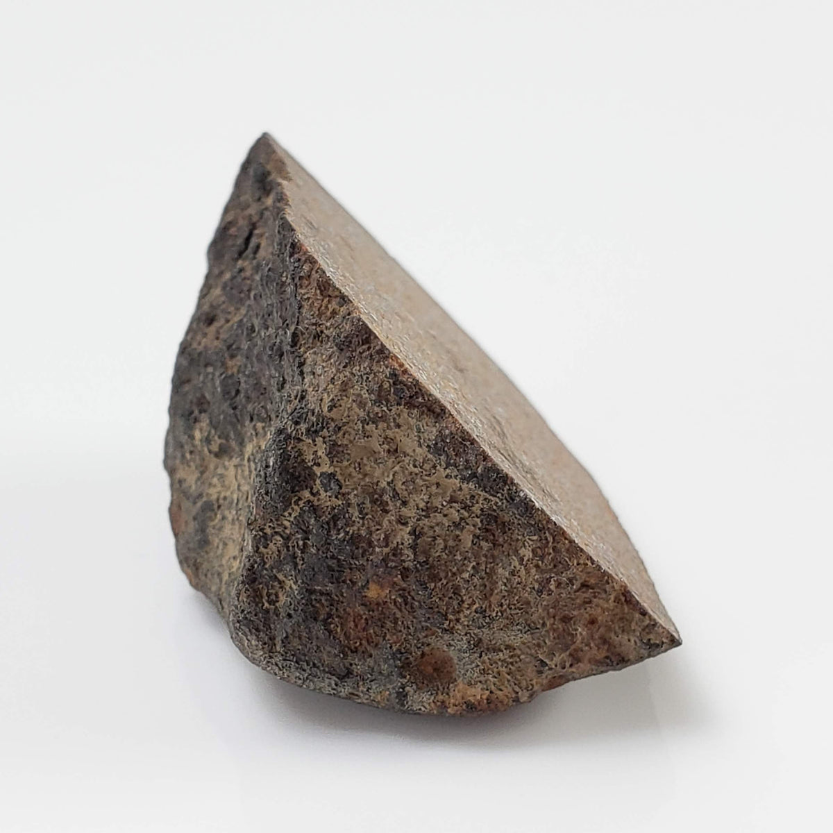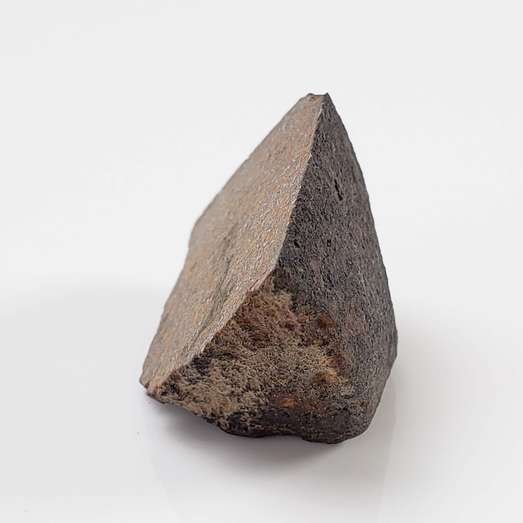 Ceci est une belle coupe terminale Gao-Guenie, une météorite classée H5 pesant 18,98 grammes. Ses dimensions sont 35x27x21 mm et elle possède un bord croûté.