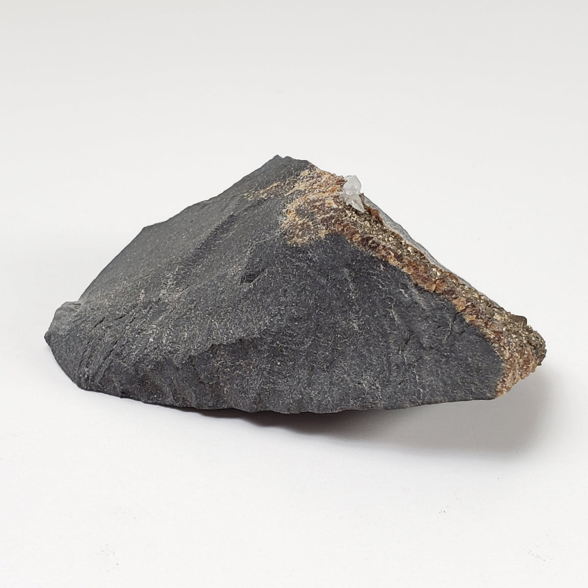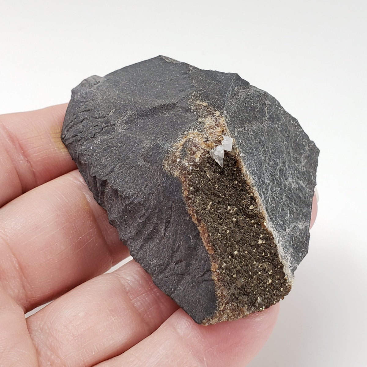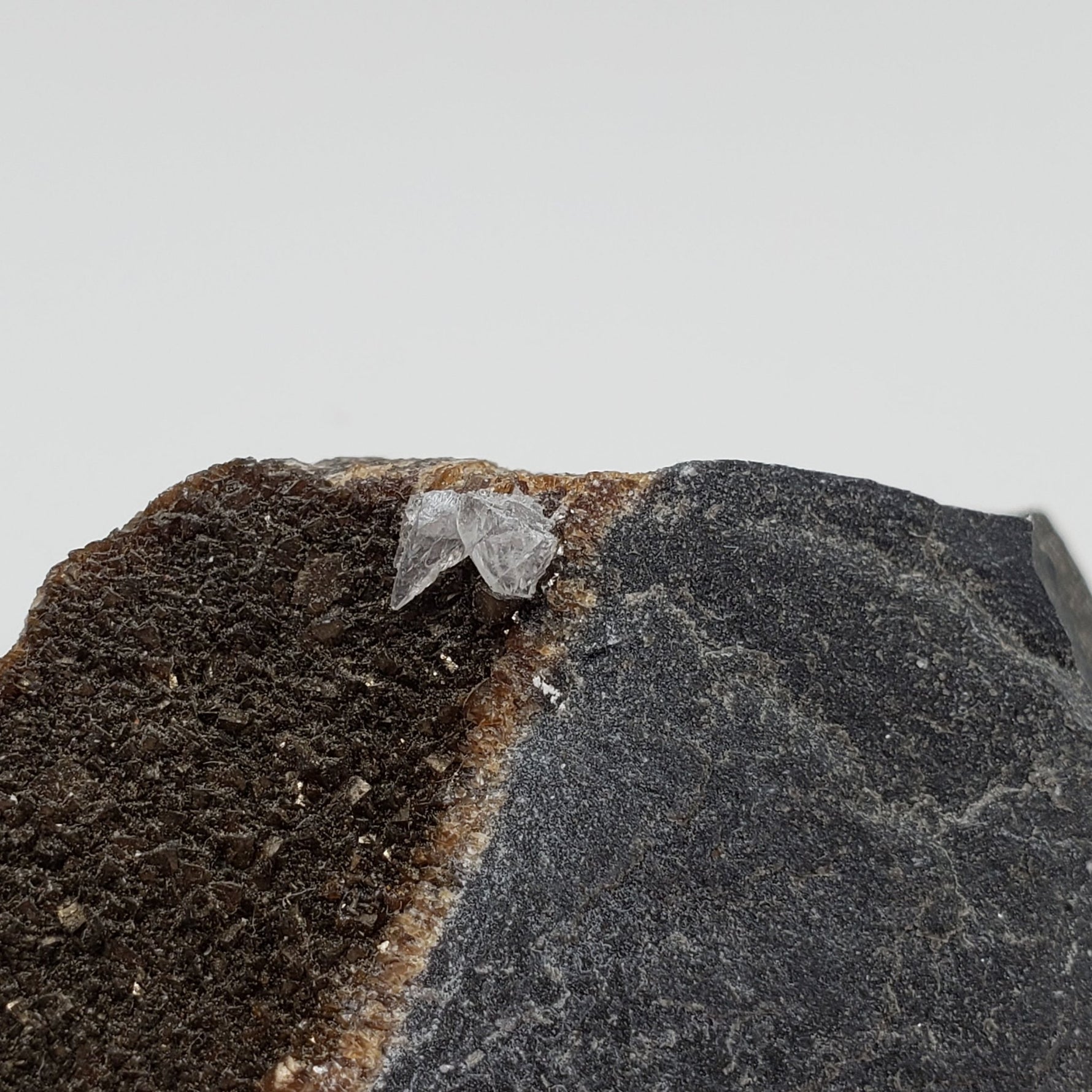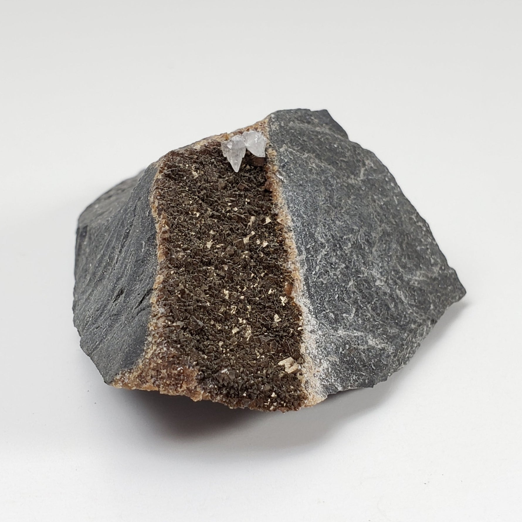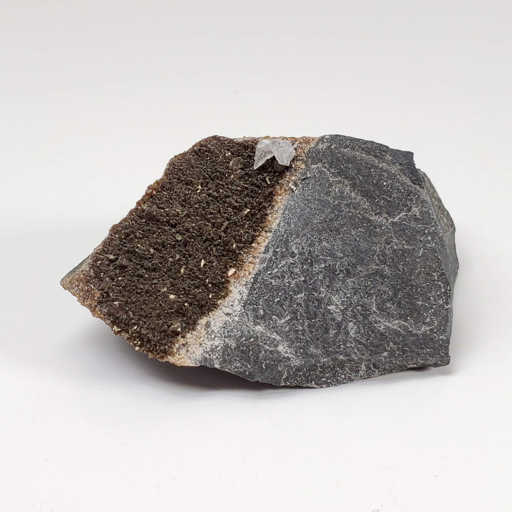 Il s'agit d'un spécimen constitué de deux types de calcite sur matrice. Le premier type est une couche de calcite foncée et irisée sur la matrice. Le deuxième type est constitué de cristaux blancs de calcite. C'est en bonne condition. Ce serait un bel ajout à toute collection nouvelle ou existante.