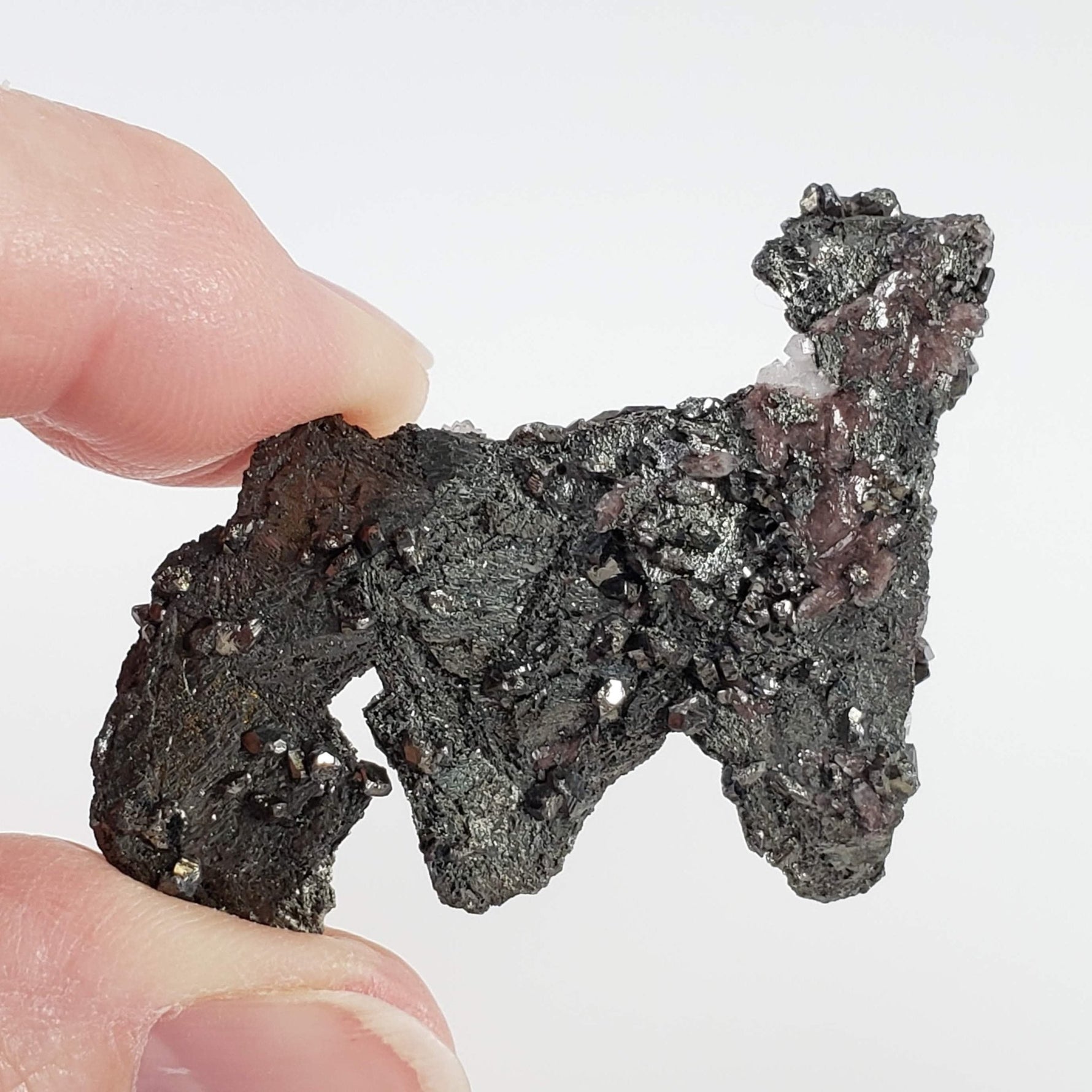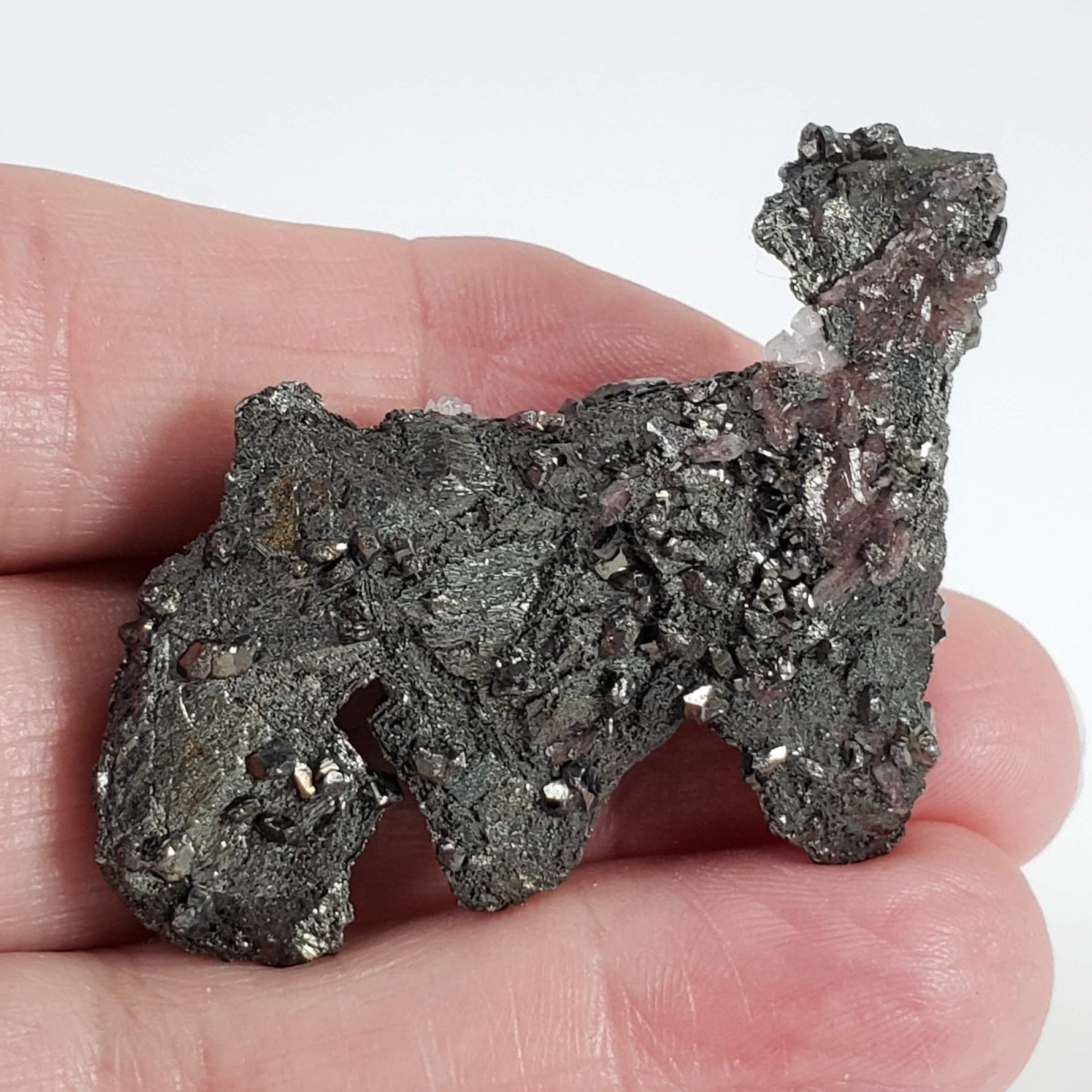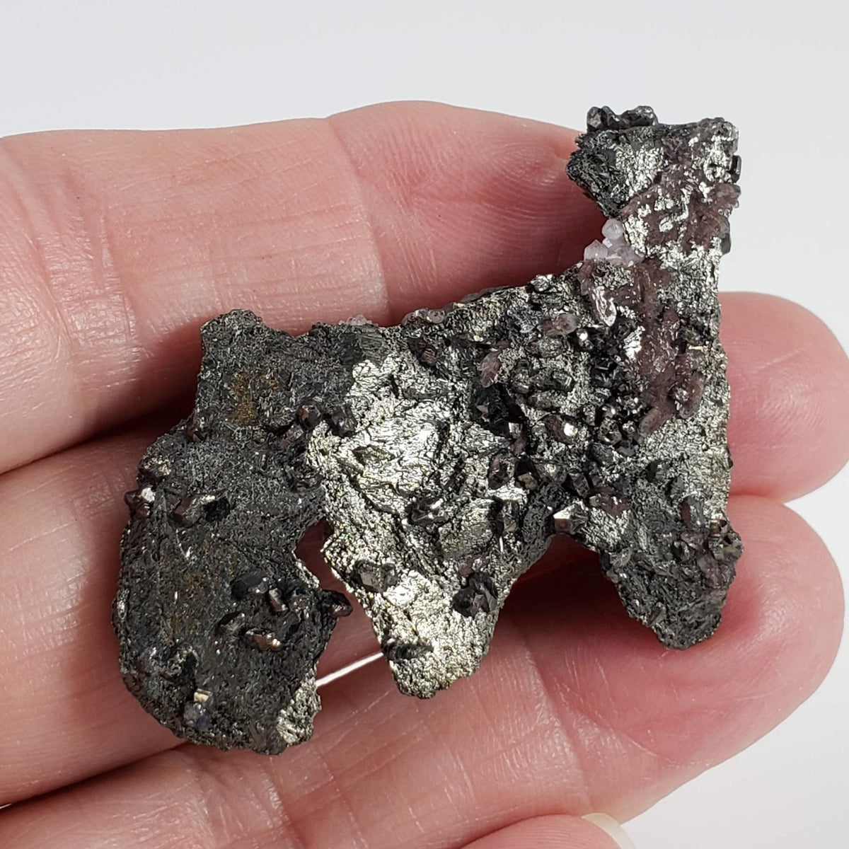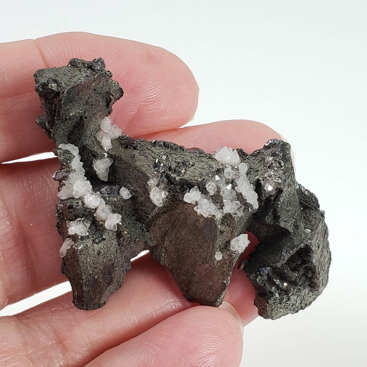 This beautiful cluster combines tetrahedrite and tiny terminated quartz crystals. Tetrahedrite crystals are fascinating minerals known for their distinctive tetrahedral shape and shiny, metallic luster. It typically forms in well-defined tetrahedral crystals, which can be grouped in clusters. The color range includes shades of metallic gray, black, and sometimes reddish hues due to the presence of copper and other trace elements. Tetrahedrite is commonly found in hydrothermal veins and is often associated with other minerals such as quartz, galena, and sphalerite.