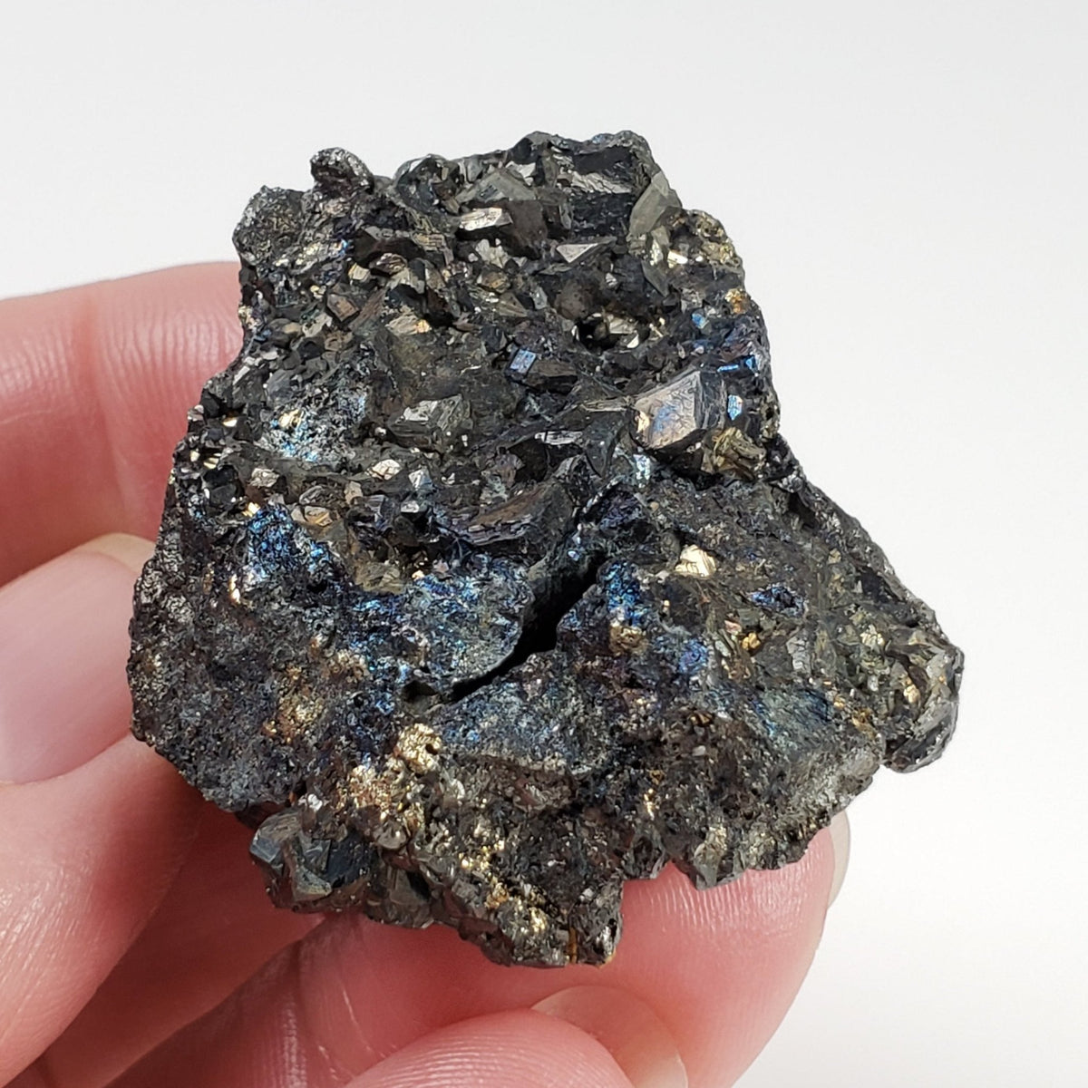 This is a beautiful cluster of metallic black and blue tetrahedrite, small crystallized pyrite matrix, calcite and brown bladed siderite. This top specimen is in very good condition. Would be a beautiful addition to any new or existing collection.